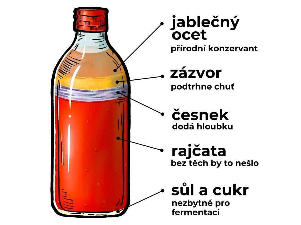 Složení: rajčata, jablečný ocet, cukr, sůl, zázvor, česnek.