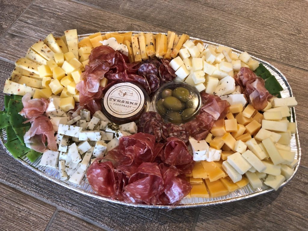 Připravíme vám luxusní obložené mísy (jednorázové nádobí) či stylová dřevěná prkna s logem (k zapůjčení, prosíme o vrácení do 4 dnů) plné delikates z naší Sýrárny.
